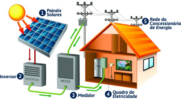 O sistema fotovoltaico transforma a luz solar em energia elétrica.